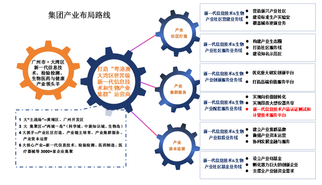 作為廣州開發區最早成立的區屬一級企業之一,高新區集團扎根于黃埔區、廣州開發區,立足于"兩軸(建設、服務)四輪(開發、城更、產服、金融)驅動產業(新一代信息技術、檢驗檢測、醫療器械、生物醫藥等)在高質量發展道路上邁向新征程"的經營發展理念,定位于產業全周期的健康生活引領者、區域全覆蓋的美好城市建設者、服務全方位的創新社區締造者,有序推進項目建設和現代服務的同時,積極加強與國內、國際創新要素密切聯動、優勢資源合理配置,打造新一代信息技術、檢驗檢測、生物醫藥與健康產業新高地,爭創產業先導區,圍繞"三大板塊,六條業務線"打造粵港澳大灣區世界級產業集群運營商。